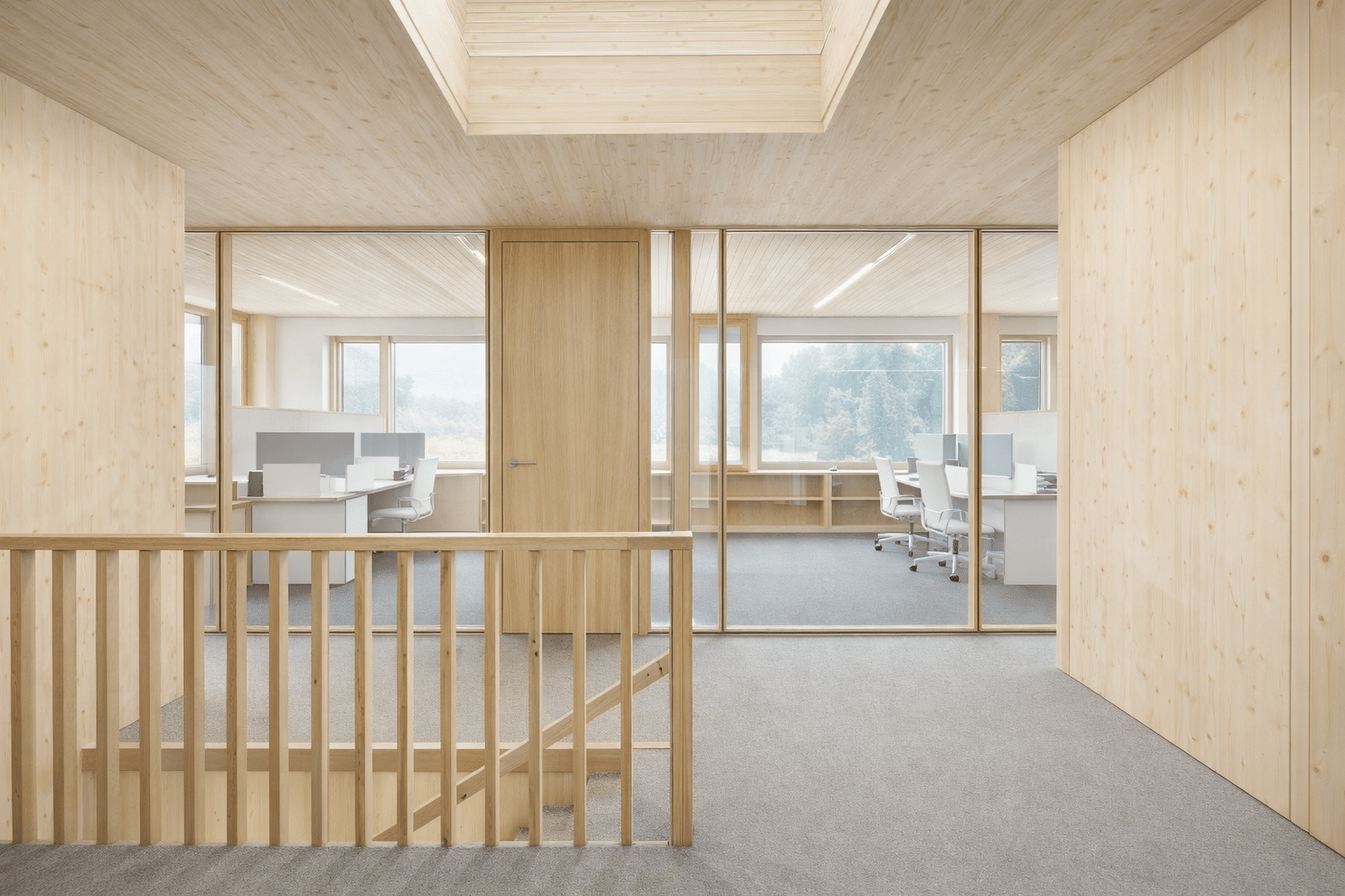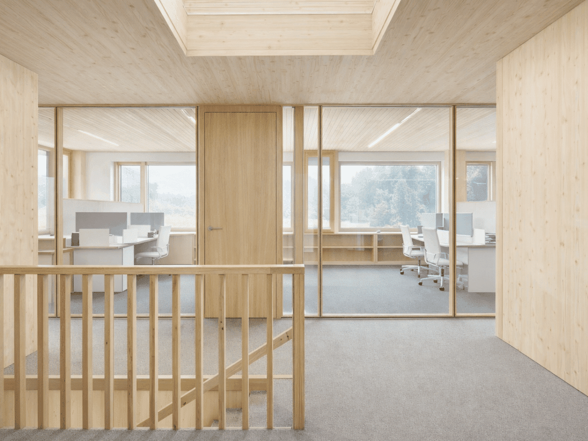 Großzügige Fensterflächen sorgen für eine hohe Tageslichtqualität und schaffen visuelle Bezüge zur Umgebung. Helle Holzoberflächen prägen die Innenräume und tragen zu einer freundlichen und hochwertigen Arbeitsatmosphäre bei.