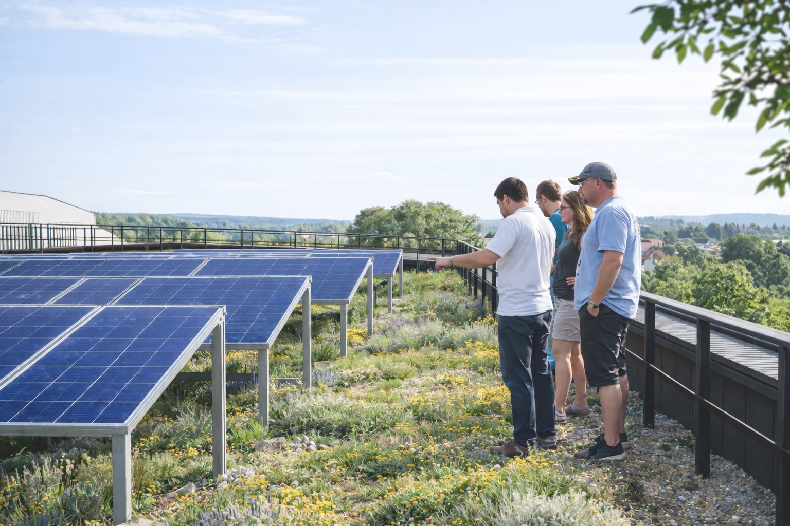 Ein zentrales Element des nachhaltigen Gebäudekonzepts bildet das Biodiversitätsdach. Es trägt zur Reduktion sommerlicher Aufheizung bei und verbessert gleichzeitig die Effizienz der Photovoltaikanlage durch ein ausgeglicheneres Mikroklima.